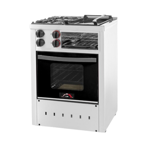 Dos hornallas, plancha bifera, carlitero y parrilla sin humo.Gabinete construído en acero inoxidable esmerilado.Interior enlozado con piso de tejuelas refractarias.Dos rejillas extraíbles de 41,5 x 36 cm.Una pinza carlitera con mango de madera.Una plancha bifera enlozada. Parrilla asadora (Cocción sin humo)Bandeja antiderrame (Colectora de grasa)Puerta de vidrio templado con mango metálico, bisagras embutidas y pirómetro analógico.Aislación térmica con lana mineral.Incluye válvula de seguridad en el horno.Rejas de fundición.Kilocalorías: 11.500